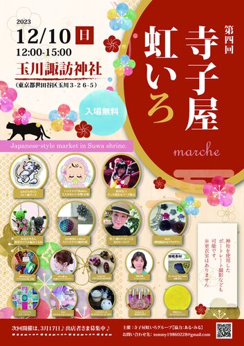 ■日時:2023年12月10日(日) 12:00〜15:00 ■場所:玉川諏訪神社社務所 子どもも大人も楽しめるマルシェです♪♪♪ お気軽にお越し下さい☆☆♪ 出店内容一覧 【寺子屋虹いろグループ】 ①とみざわきららワンコイン占いとつがねこグッズ販売 ★ワンコインで気軽に占い…